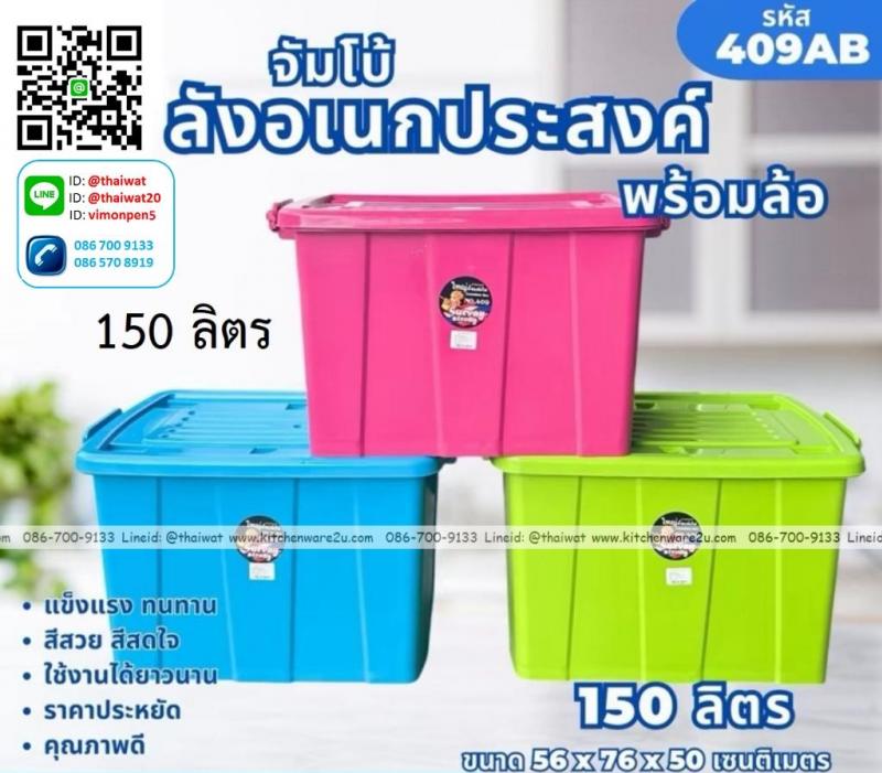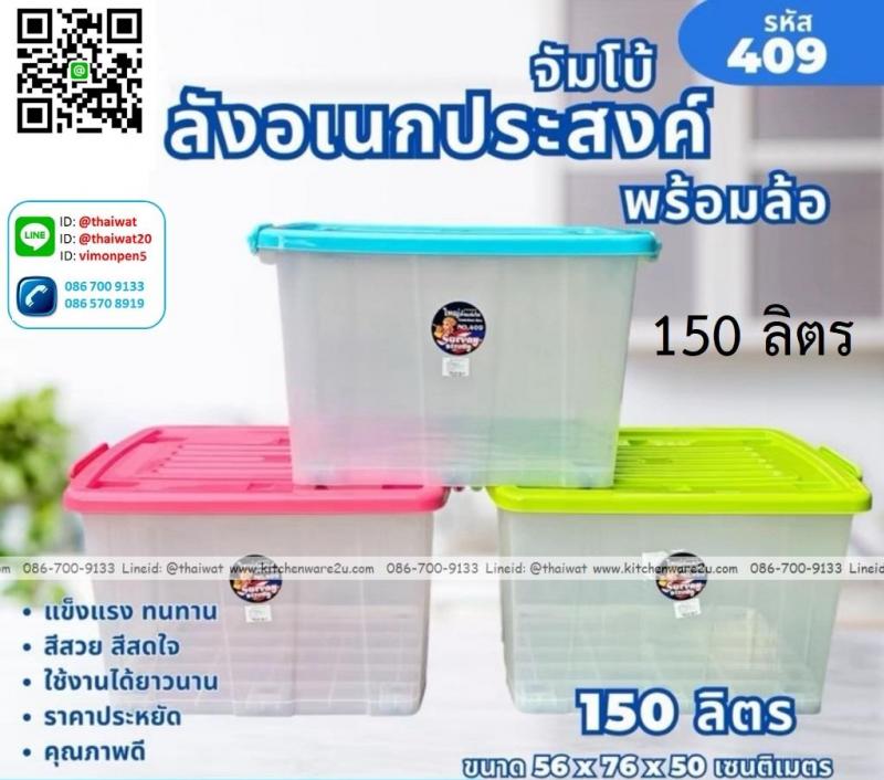 P13264 กล่องเอนกประสงค์ ล้อเลื่อน 150 ลิตร (56*76*50 cm) เกรดเอ No.409A (ราคาขายส่งต่อ 4 ใบ:เฉลี่ย 480 บต่อใบ) (12 ใบขึ้นไป เหลือ 470บต่อใบ)