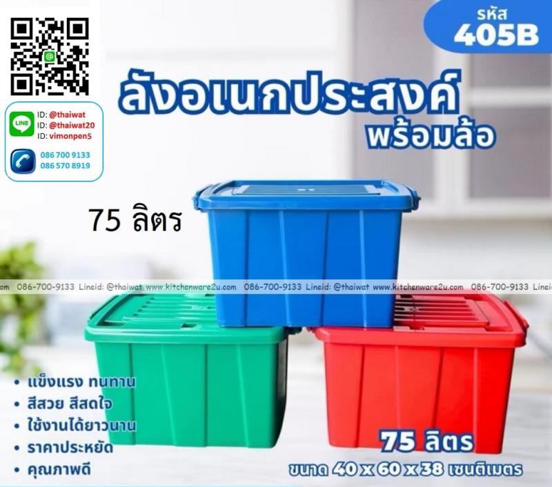 P13262 กล่องเอนกประสงค์ ล้อเลื่อน 75 ลิตร (40*60*38 cm) เกรดบี รุ่นประหยัด No.405 ราคาขายส่งต่อ 1 โหล: 12 ใบ : เฉลี่ย 115 บต่อใบ
