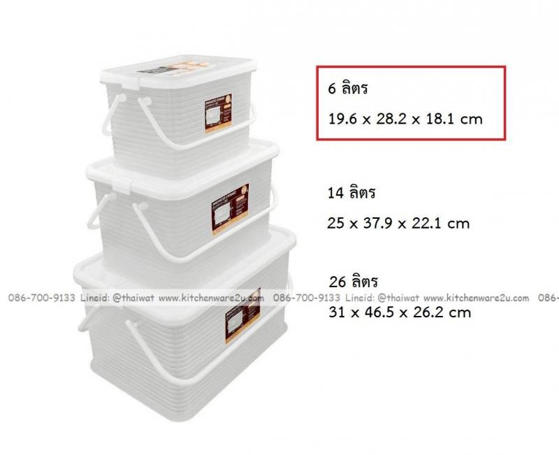 P13961 กล่องเอนกประสงค์ หูหิ้ว 6 ลิตร (19.6*28.2*18.1 cm) เกรดเอ No.HK-619 ราคาขายส่งต่อ 1 โหล: 12 ใบ: เฉลี่ย 85 บต่อใบ
